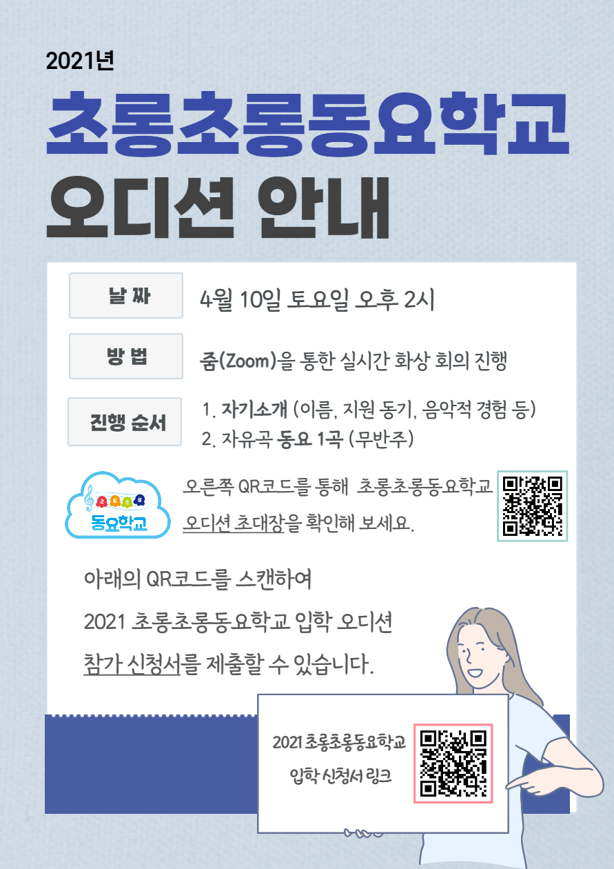 5. 신청방법 초롱초롱동요학교 사무국장 010 4829 9160으로 지원 학생의 거주지역, 학교, 학년, 이름을 문자로 보내면 참가 신청 링크를 전송받을 수 있습니다. 아래 홍보물의 QR코드로도 신청 가능합니다.