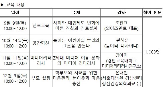 ▶ 신청 방법: 학부모지원센터 홈페이지(www.gne.go.kr/parents)⇒ 학부모교육 신청 ⇒ 신청하기